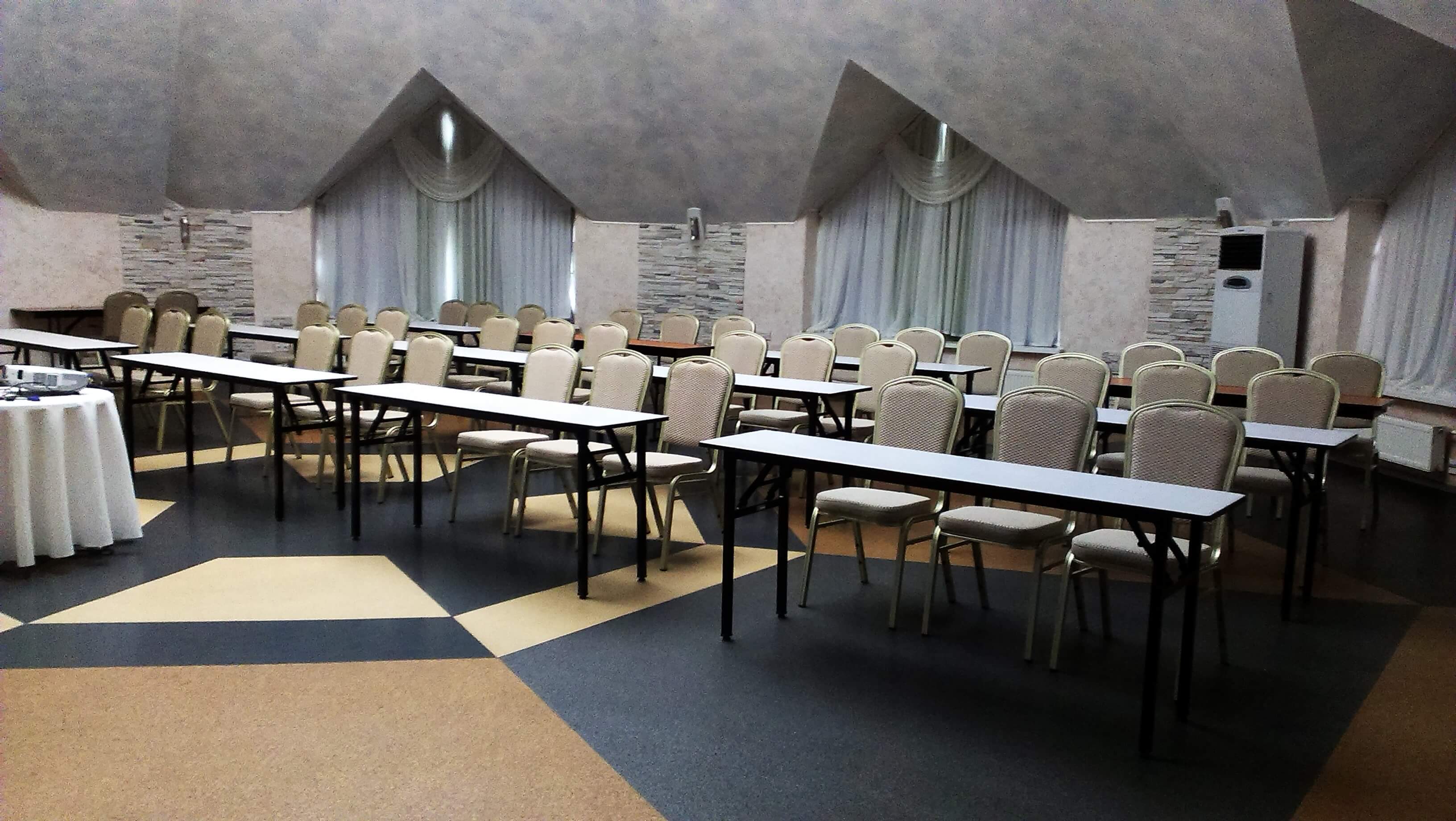 Конференц-зал площею 160 кв. м. найкраще підходить для заходів, що розраховані на 30-50 гостей. Тут зручно провести круглий стіл, конференцію,банкет, важливі переговори, семінар та тренінг.
